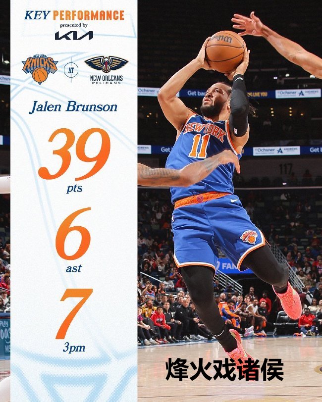 布伦森三分球10中7轰下赛季新高的39分率队取胜,尼克斯获取3连胜,18胜10负排在东部第三。